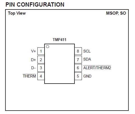 TMP411ADR features: (1)±1℃ remote diode sensor; (2)±1℃ local temperature sensor; (3)programmable non-ideality factor; (4)series resistance cancellation; (5)alert function; (6)programmable resolution: 9 to 12 bits; (7)programmable threshold limits; (8)two-wire/smbus serial interface; (9)minimum and maximum temperature monitors; (10)multiple interface addresses; (11)alert/therm2 pin configuration; (12)diode fault detection.